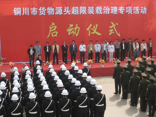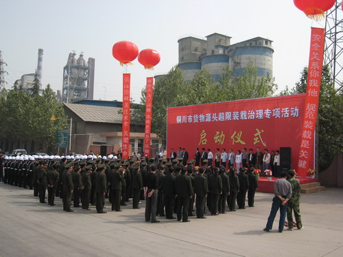 2008年4月30日上午,铜川市在陕西秦岭水泥(集团)股份有限公司举行全市治理货物源头超限装载启动仪式。仪式由市政府副秘书长、市治超领导小组副组长惠善利主持,市委常委、副市长王省安出席并讲话, 省交通厅治超办张虎主任、省交通厅运管局张兴东副局长、省公路局路政处梁晓强副处长应邀出席了启动仪式。各县(区)分管县(区)长、市治超领导小组成员单位领导、各县区交通局长、运管所长、公路站长、治超检测站长、计重收费站长,各重点货物源头企业代表及铜川日报社、铜川电视台等新闻单位参加了启动仪式。