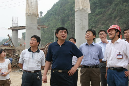 6月15日下午,交通部质监总站李彦武站长在省交通厅胡保存副厅长、厅质监站薛生高站长、宝鸡市政府张积勤副秘书长、市交通局商宝庆局长等领导同志的陪同下,深入宝天高速公路陕西段施工现场,检查工程质量安全管理工作。