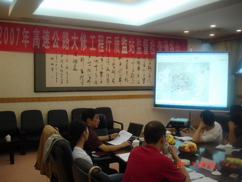 随后省厅质监站在采取多媒体的形式对本次综合监督检查的情况进行详细的通报,指出以下主要问题和建议:一是原材料堆放应严格按要求存放、覆盖和使用,特别是泡沫沥青再生基层的铣刨料堆积过高、有结团现象。二是有部分沥青面层施工目标、生产配合比与实际生产不一致。三是沥青面层施工现场有压实速度快、机械组合不到位、碾压终了温度偏低等问题。四是个别监理人员业务能力不高、责任心不强、措施不得力。五是渭潼大修项目对结构方案的变更为见到省厅的批复或补充修改设计文件等等。内业方面,原材料试验自检指标偏少,其余指标外委频率不足;西阎、西户、渭潼不同规格碎石、石屑均有个别筛孔通过量超规范值现象;渭潼配合比设计与现场实际用料不符等情况。