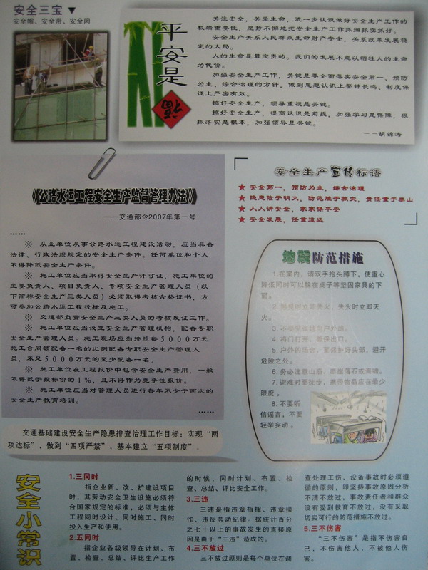 为普及安全生产常识进项目、进工地、进人心,进一步加强安全生产知识宣传教育,提高全体从业人员安全生产意识,促进我省高速公路建设项目安全生产再上新水平,厅质监站于近期印制交通建设安全生产知识宣传单,免费广泛向高速公路项目施工一线发放。下图为宣传单正面图。