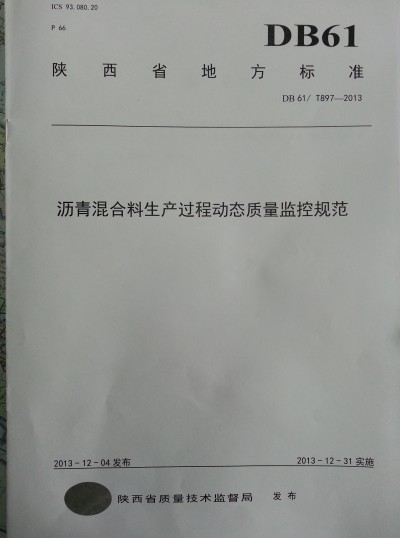 陕西省交通厅基本建设工程质量监督站、长安大学、陕西长大控制数据有限公司编写的《沥青混合料生产过程动态质量监控规范》(DB61/T 897-2013)已经陕西省质量技术监督局2013年12月4日发布,自2013年12月31日起实施。
