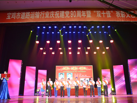 6月20日,宝鸡市道路运输行业举行庆祝中国共产党建党90周年暨“双十佳”表彰文艺汇演。宝鸡怡丰汽车服务有限公司出租车司机马宝平等 10人被评为出租车行业“十佳服务明星”,宝运高速客运公司“陕 C-19016”等10辆客车被授予“十佳文明班线客车”。 伴随着200余人的大合唱《在灿烂阳光下》和《祖国不会忘记》,表彰大会拉开了帷幕。来自全市道路运输行业的员工用合唱、歌舞、快板等精彩表演,表达了对党、对祖国、对人民的热爱之情,展现了运管人昂扬向上的精神风貌。市领导、市文明办、市委宣传部、市纠风办、市监察局、市交通运输局等部门领导及1000余名道路运输行业职工一同观看了文艺汇演。