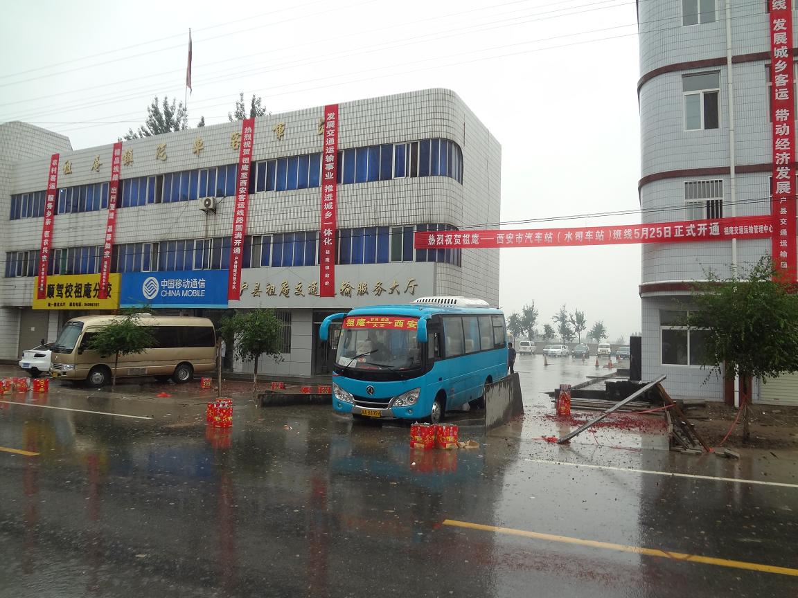 5月25日,户县祖庵镇经大王至西安市汽车站的客运班线正式开始运营。该线路由户县欣源客运服务有限责任公司负责管理,全长55公里,途经甘河、涝店、渭丰、大王四镇,共投放12辆27座东风牌客车,线路的运营采用循环发车方式,运营时间为(祖庵镇)首班车早5:30,(西安市汽车站)末班车晚19:00,每20分钟一趟,全程票价(含燃油附加费)13元。