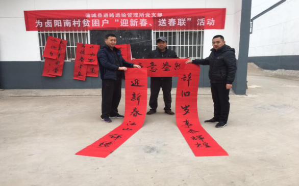 新春佳节临近,为创造更浓的节日氛围,1月25日上午,带着对贫困群众的关心和问候,蒲城县运管所组织帮扶干部来到党睦镇卤阳南村开展“迎新春、送春联”活动,为贫困户送去了新年的祝福和美好的祝愿。
