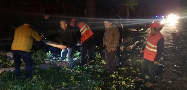 长安公路段接到信息后,段领导高度重视,紧急启动突发事件应急预案,并与当地政府和林业部门联系沟通后,及时将公路管理股和路政大队部分人员组成突击小组赶赴现场。现场有9棵行道树因受强风影响,出现不同程度断裂、倾倒,导致部分路段交通中断。尤其是该路段还有一所小学,当时正是学校放学时间,路上行人车辆较为集中,倾倒的行道树给过往车辆行和当地群众、学生带来极大安全隐患。突击小组迅速在危险路段两端设置警示标志,疏导交通。连夜组织人员、机械设备将倾倒行道树进行砍伐、吊运,并清理路面上的树枝、落叶。经过4个多小时的不懈奋战,于当日晚上10时多,所有倾倒在路中的行道树全部清理完毕,消除了安全隐患,交通恢复了正常。