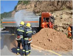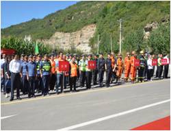此次演练模拟因长年风化,雨水冲刷,导致G242K1006+550处高边坡发生塌方,阻断交通,一辆危化品车辆单方肇事,人员受伤,车辆起火,存在危险品泄露隐患,需交警、消防、急救中心及地方政府、道路救援车驰援。