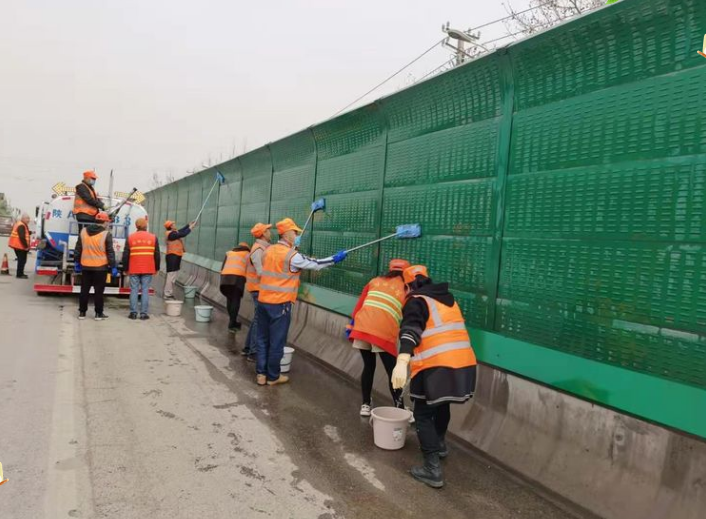 3月16日下午,全体职工身穿橘红色标志服,打着“迎全运盛会 展公路人风采”的宣传标语,来到G108西潼路跨线桥,在整齐摆放标志桶的安全区域,对桥梁隔音屏进行清洗。首先,用洒水车水炮进行冲洗,紧接着同志们拿着手中的拖布、抹布,开始擦洗。擦洗现场,大家紧张有序,认真负责,努力做到不放过一处死角。擦洗后,再用洒水车水炮进行收尾。