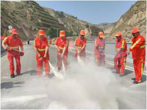 此次演练背景模拟该段在沿黄观光路巡查过程中,发现K407+600米处道路交通事故,导致车辆大量燃料流到路面,存在重大安全隐患。