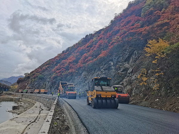 该工程项目起于柞水县朱家湾村盘古山庄K28+728.42,止于柞水营盘大桥K43+000,工程全长9.83Km,路面宽度10.0米,路面结构形式为20cm厚水泥稳定碎石底基层+20cm厚水泥稳定碎石基层+热沥青同步碎石封层+5cm厚AC-20沥青混凝土下面层+黏层+4cm厚AC-13沥青混凝土上面层。项目部把学习贯彻落实党的二十大精神与当前施工任务相结合,切实贯彻落实党中央“疫情要防住、经济要稳住、发展要安全”总要求,统筹做好疫情防控和工程施工建设,狠抓工程质量,加快施工进度,注重安全生产,目前该项目按照施工计划进展顺利,预计11月中旬全部完工,G211柞水大坪至营盘改建工程项目的建成将为带动当地旅游经济发展和乡村振兴做出积极的贡献。