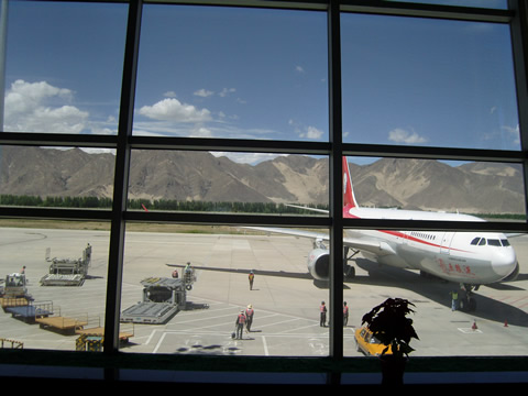 27日上午,来自交通系统我们一行十四人,从咸阳机场起程,赴西藏考察学习七天,大家坐在候机厅,心潮起伏,难于言表。12点到30分左右,终于登上了东方航空公司MU2335班机。飞机大约飞行了一个小时多,坐在机窗口的我看着天际白云朵朵,似乎是白莲花般簇拥着我们迷迷糊糊中感受到飞机开始颠簸晃动,有一个声音传来“我们在经过唐古拉山!”急忙望向窗外:哇!我们在雪山顶上飞行,成片的雪山峰上积满了皑皑的冰雪。飞机受强气流的影响开始剧烈颠簸摇摆,突然感受到进入西藏的怀抱,这个颠簸都和以往的不一样!很强烈很震动。飞机开始要降落的二十分钟很刺激惊险,开始剧烈抖动,忽上忽下的来回起伏,很多人开始惊吓得大叫。突然飞机猛烈下滑我感觉到肚子中有一股股抽搐。有很多人开始呕吐,我倒没有任何吐的感觉,只是觉得有些头晕。坐在我身旁于峰副主席说:“哇!怎么还没有看到城市就降落了?”我一看光秃秃的山脉,飞机几乎贴山而飞行,哪有什么城市啊,连个房子都没有!只有一些黄枯枯的杂草偶尔在一边挺立。好像风沙很大,但看不到树就感受不到飞机外面的情况,感觉到驾驶员的飞行技术非常的娴熟机智勇敢,飞机在经过多次颠簸,摇晃,震颤后进入两山之间的河谷,在还没缓过神的当下,飞机稳健的降落到贡嘎机场。途经由于受到气流的影响飞行中遇到几次气流,经过2个半多小时飞行,终于降落在拉萨贡嘎机场。拉萨贡嘎机场位于西藏自治区山南地区贡嘎县甲竹林镇,坐落在壮丽的雅鲁藏布江南岸,海拔3600米。
