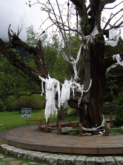 树上有很多哈达,这是珞巴族人许愿挂上去的,祈求自己和家人平安。听卓玛西亚说,秋天,树上的叶子颜色也各不相同,有红有黄,还有的树枝上根本就没有叶子。珞巴族信仰的是万物都有灵的原始巫教,他们相信万物一切皆有神灵,特别是对生殖崇拜尤为虔诚,又因他们珞巴族人口较少,至今当地群众仍相信对阴阳树的朝拜能人丁旺盛。