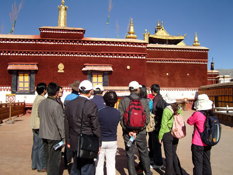 当天中午,大家在休息片刻之后,有冒着酷暑、顶着烈日继续前往西藏最古老的神庙大昭寺参观。此寺始建于七世纪,距今已有1350年历史,是西藏最神圣的殿宇之一,海拔3658米。主供文成公主自大唐迎来的释迦牟尼12岁等身金身佛像,庄严无比,是所有藏人心灵中最神圣之处,此地随处可见五体投地的虔诚藏人顶礼膜拜。大昭寺内壁画、浮雕、塑像等都与唐代内地的风格相似,寺内保存有唐代以来的大量历史文物。
