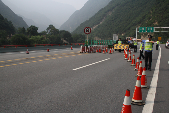 户县管理所防汛保畅工作领导小组接到报告后立即启动防汛保畅应急预案。10分钟内,户县路政中队、养护股工作人员协同应急救援小分队、清障施救车辆等抵达现场。此时,堵塞现场如不及时实施分流疏导,将会导致大量车辆滞留。对此,户县管理所防汛保畅工作领导小组果断决定实施单幅双向分流车辆。路政中队增设交通警示标志、设置警戒区域,做好交通管制工作,引导车辆分流。15:43开始单幅双向分流工作,现场滞留车辆开始按照指定的绕行路线有序通行。此时,养护股协同应急救援小分队人员组织抢险队员和机械加紧事故现场清理工作。16:20,当班巡查员在滑坡现场汇报,京昆高速西汉段K1142+600(下行)山体滑坡交通阻断事故处理完毕,现场山体地质结构稳定,具备安全通行条件,可以恢复通行,请求解除单幅双向。随后,户县管理所防汛保畅工作领导小组下达命令,解除交通管制、恢复正常通行,解除应急状态。12分钟后,待单幅双向保畅物资全部撤销完毕后,道路恢复正常交通秩序。