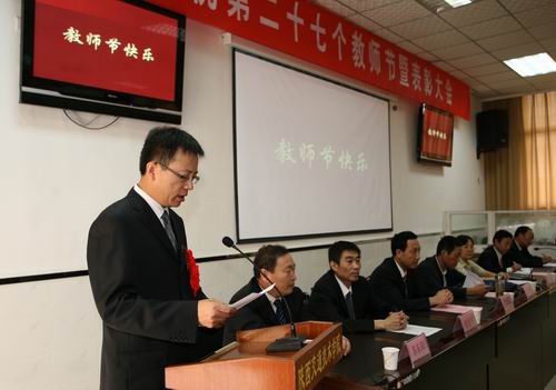 会上,陕交院对2010——2011学年先进集体、优秀教师及先进教育工作者进行了表彰。厅科教处马秦处长宣读了《陕西省交通运输厅关于表彰慰问陕西交通技术学院的通知》。院长杜建忠代表学院领导班子对全体教职员工表示节日的问候并提出两点希望:一是希望全体教师勤学习、勤思考、勤工作,爱岗敬业,勇挑重担,敢于负责,勇于争先;二是希望全体教职员工牢固树立“不进则退,慢进也是退”的忧患意识,继续弘扬“爱岗、敬业、奉献”精神,为学校迈向新的辉煌前程而不懈努力。