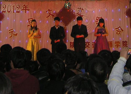 12月30日晚,陕西交通技术学院张灯结彩,喜迎2012年元旦,学院特举办以“狂欢元旦,喜迎新年”为主题的文艺游艺晚会,师生载歌载舞,在欢声笑语中迎接新的一年。活动由学院党办工会主办,团委学生处承办,其它部门协助。