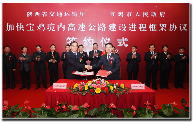 为进一步完善全省高速公路网络,带动和促进宝鸡市关天经济区副中心城市建设,2月23日,省交通运输厅与宝鸡市政府就加快宝鸡境内高速公路项目建设签署框架协议,厅党组书记、厅长冯西宁与宝鸡市代市长上官吉庆在框架协议上签字。