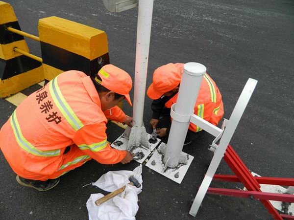 速凝混凝土砂浆是由水泥、沙子和速凝剂按一定比例配合而成,具有凝固快、微膨胀、稳固性强、抗裂抗渗、抗蚀防腐的特点。在加固过程中,首先将原有的固定螺丝全部卸掉,更换成大号的膨胀螺丝,其次在预留孔内灌入速凝混凝土砂浆,打入膨胀螺丝,等混凝土砂浆初凝后及时上紧固定螺丝,最后在混凝土砂浆终凝后,仔细检查加固部分,确保螺栓和标志牌之间连接紧密,固定牢固,接地可靠。