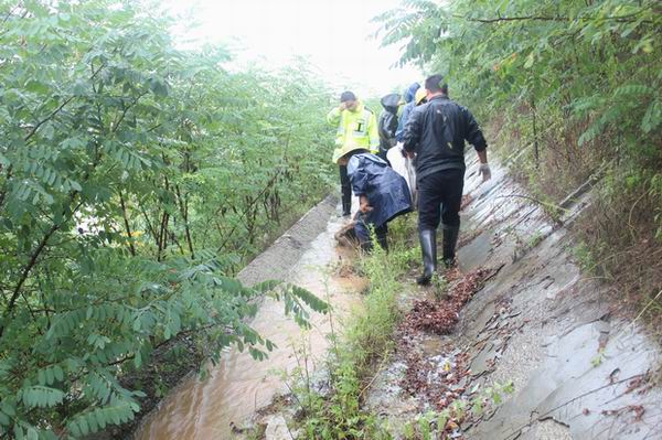 险情二:服务区宿办楼左侧高边坡有塌陷情况,在塌陷处水流较大,塌陷面积达60—80立方米,值班领导立即向分公司相关领导,分公司就近安排石泉管理所抢修高边坡滑塌,抢险人员一方面切断塌陷地方的水源,防止高边坡再次塌陷,另一方面挖通临时排水渠排水。
