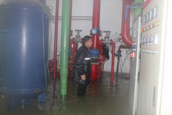 险情三:安全小组在对全区进行安全检查时,发现主区水泵房积水达80公分,且水仍大量涌入,经查由于房外积水大量渗漏和污水管道排水不畅导致积水大量回流所致。机电小组当即采取用水泵抽水和室外用沙袋阻隔积水措施,目前险情得到有效控制。