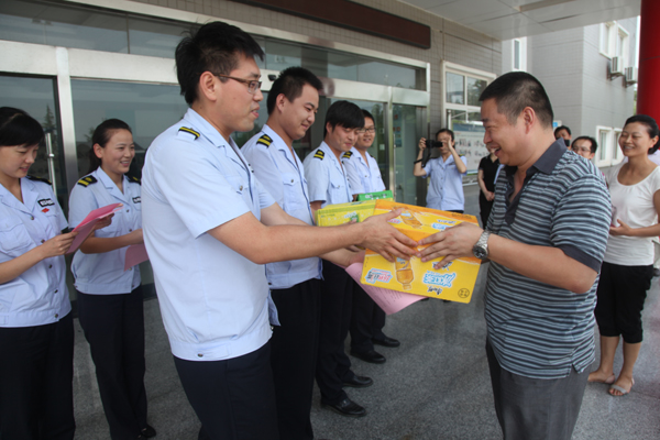 7月26日,机场分公司经理楚锟、工会主席崔敬带领分公司各部门负责人,携带茶叶、绿豆、饮料等防暑物品,深入分公司各收费站对一线员工开展“送清凉”活动。