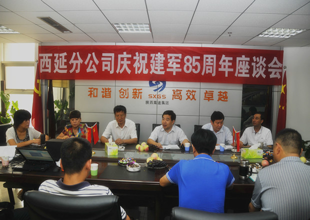 为庆祝中国人民解放军建军85周年的到来,7月30日,西延分公司组织机关科室、路政大队复转军人代表共20余人召开了座谈会,向广大复转军人致以节日的问候,并鼓励复转军人继续发扬优良传统,争做学习、工作和维护稳定的标兵。