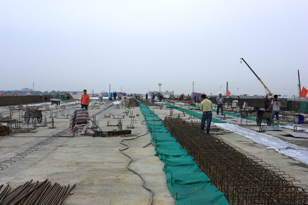截至目前,阿房宫立交主线及匝道路基工程已趋于尾声,主线桥梁进入桥面铺装阶段,边坡整形完成大半,并全面展开防排水工程和绿化工程施工。