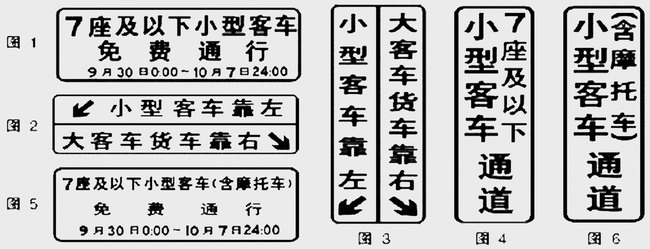 免费通行临时交通诱导标志牌分高速公路主线和收费站,普通收费公路收费站两大类,均为白底黑字黑边框。其中高速公路主线和收费站免费通行提示标志牌(图1)设在大中城市周边高速公路主线收费站以及匝道收费站的入口处;车辆分流标志牌(图2、3)设在收费广场前的适当位置;收费道口识别标志牌(图4)设在收费岛头前。普通收费公路收费站免费通行提示标志牌(图5)设在普通公路收费站收费广场前的适当位置;收费道口识别标志牌(图6)设在收费车道的岛头。