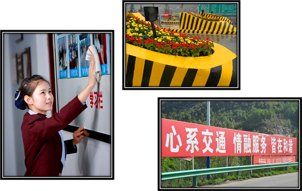各收费站组织人员清理广场、车道、安全岛、边坡垃圾,对车道防撞护栏、防撞柱、隔离墩、道沿进行刷漆,摆放鲜花和绿色植物,悬挂五星国旗、彩旗、灯笼,并在收费广场、可变情报板等显要位置发布节日用语。设置便民服务台,确保工具箱、医药箱、饮用水、行车指南、灭火器等服务用品齐全。