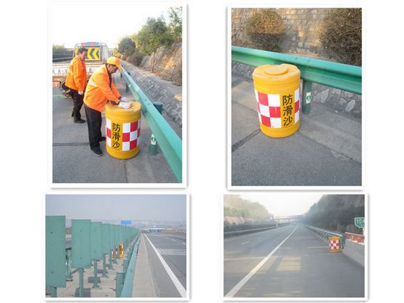 针对以往采用编织袋放置防滑沙的“传统”方法所带来的易破损、易风化,易丢失的缺陷,阎良管理所养护人员结合工作实际,选用防撞桶放置防滑沙较好地解决了以上问题。具体做法是:首先将防撞桶外表贴上反光条,而后按照养护管理要求分别放置于路堑段、大型桥梁的硬路肩、中分带等关键部位,最后将防滑沙装入其中。此存放方法具有外形美观、安全耐用、警示提示、存量大的优点。目前,阎良管理所在所辖路段上已放置装有防滑沙的防撞桶50余个,为做好冬季道路防滑工作奠定了良好基础。