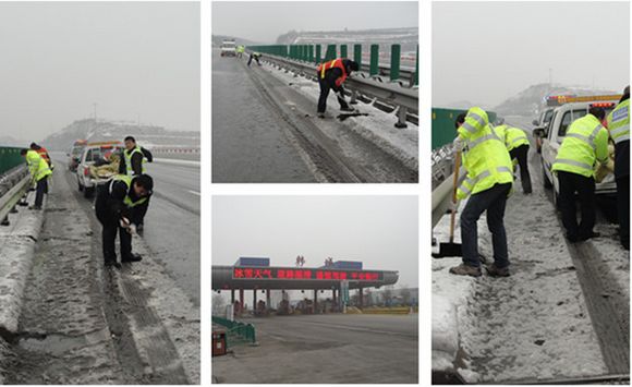 一是管理所第一时间启动《冬季道路除雪保畅应急预案》,组织路政、养护及各收费站成立道路除雪保畅应急分队,迅速落实人员、物资及车辆,对所辖路段坡道、桥梁、事故多发区及挖方段抛洒融雪剂及防滑砂,同时加强对急弯、陡坡、桥梁等重点路段进行除雪作业,确保道路安全畅通。二是加大宣传力度,及时通过LED电子信息情报板及道路可变情报板告知司乘人员“雪天路滑、谨慎驾驶”,并对所辖路段路面积雪情况进行实时监测并及时发布实时路况信息。各收费站利用收费窗口及时向司乘人员告知天气情况及路况信息,并在车道出入口张贴温馨提示语,提醒司乘人员注意行车安全。三是在组织人员除雪的同时,管理所稽查股、各收费站进一步加强收费现场管理,密切注意车流量变化,积极做好司乘人员工解释工作,随时对车辆进行疏导分流,防止了发生拥堵。 四是切实做好便民服务工作,配备足够的医疗用品、热水及食物等生活急需品,为司乘人员提供基本的生活物资,满足其基本生活需求,进一步加强文明服务工作,坚持微笑服务和手语服务,增加温馨提示语,及时为司乘送去温暖与关怀,热情周到的服务赢得了过往司乘的一致称赞。