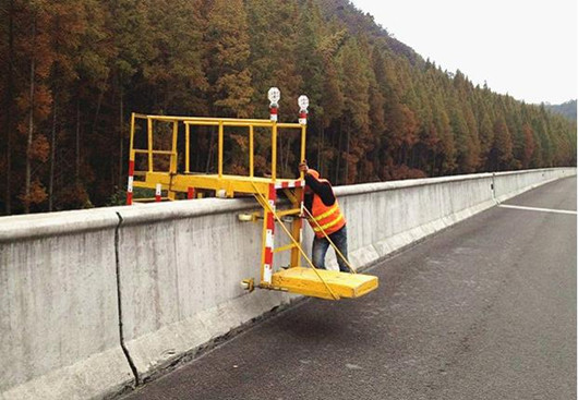 该“观测臂”是一种可以为桥梁下部检查人员在观测过程中提供作业平台,用于流动观测和维修作业的专用工具,主体由基础结构、上部结构及下部结构组成,采用铸铁材料焊接而成,外观为醒目橘黄色。作业时观测臂包裹桥梁防撞护栏,人员通过安全梯下到底部作业平台作业;设置多组滑轮,既实现观测臂自身与桥梁结合的调节,又能提供上部作业人员推动臂体,移动观测位置。该工具自应用到养护工作中来,对于桥梁观测和作业带来极其优越的作用。