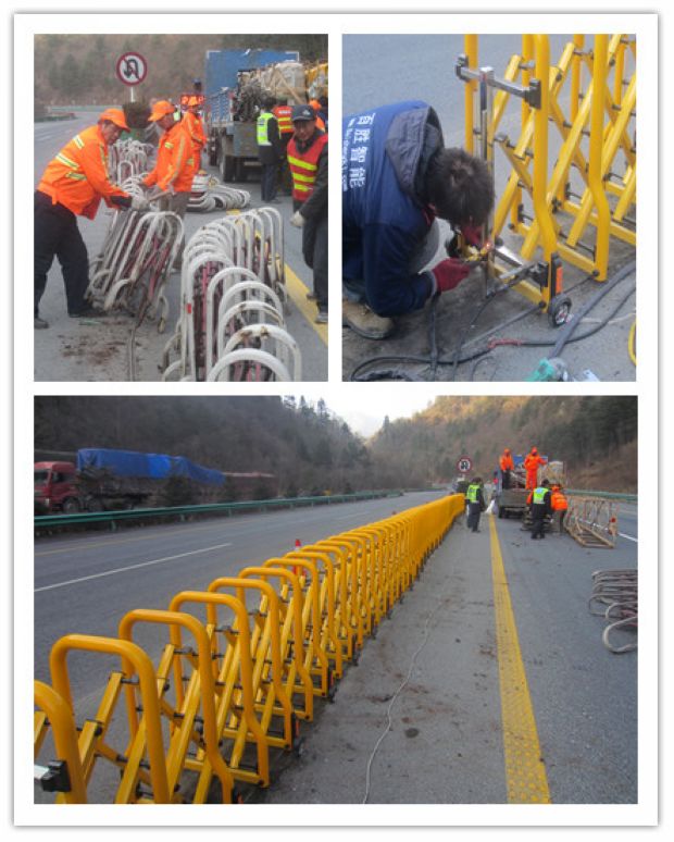 管理所组织专人针对沿线伸缩护栏使用情况及存在的隐患进行了详细调研、分析,制定了详细的解决方案,提高设施的使用寿命。首先从采购源头上经过多方面对比,采用不锈钢制伸缩护栏,延长使用期限;其次在安装工艺上根据实际使用情况,考虑到夜间山区风大,容易将护栏吹偏占用车道,影响行车安全,在护栏中间部位设置插销固定锁,护栏端头一端使用卡子固定牢固,并进行焊接,另一端使用插销,在确保牢固可靠的同时又保证使用便捷。