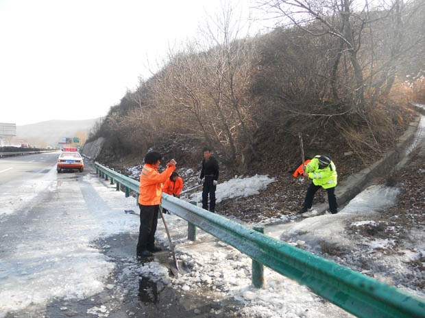 一是对管辖路段桥梁、隧道、护坡等重点部位进行拉网式排查,发现一处登记一处,及时给养护部门发放除冰通知单。二是巡查车辆配备锥形桶和铁锨,在发现有少量结冰时,及时摆放锥形桶,进行清理。三是与施工单位密切配合,在施工单位除冰时,路政中队负责做好警戒工作,保证施工人员和过往车辆安全。四是做好安全提醒工作,及时与监控室做好沟通,在发现有积冰的路段,通过沿线电子情报板进行提醒。