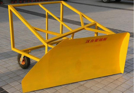 四轮铲冰除雪车用人工作业,由三部分组成,除雪铲,固定推杆和滚轮。前部推雪铲可以升降,不与路面直接接触,不会对路面造成伤害。固定推杆,简单易行,便于养护人员操作。除雪车的轮胎增加车体的机动灵活,提高了铲冰除雪效率。此工具的创新应用将给冬季养护工作带来重要意义:一、结构简单易行,功能齐全。四轮铲冰除雪车整体小巧轻便,操作设计简单易行,任何养护人员都可以操作上岗,比起使用多功能除雪车,省时省力。同时在冬季养护中既能除雪又能铲冰,实现多功能。二、设计巧妙,提高效率。除雪铲可以调节,适用不同坡度和积雪厚度的路面状况;固定推杆的工作时动力臂大于阻力臂,平衡时动力臂小于阻力臂,应用时更省力,和多功能除雪车并用时可以弥补大车除雪时落下的角落。滚轮设计,增加了车体灵活程度,同时在轮胎上增加了防滑沟槽、在胎面上镶钉,使铲冰除雪车具有防滑功能。一个“四轮铲冰除雪车”顶8个人工的劳动量,应用实效大大提高。三、经济实惠,节约养护成本。该工具自身设计简单,使用方便,可实现冬季除雪铲冰多项任务,和以往纯粹使用多功能除雪车相比节省了相当一部分开支。