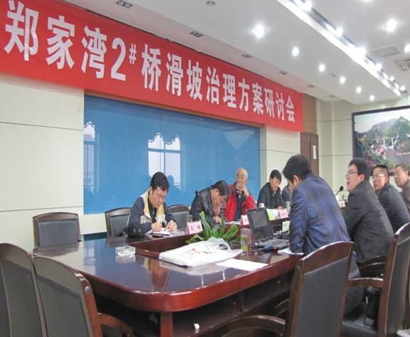 当天上午,与会专家对郑家湾2#桥古滑坡体进行了实地考察,并详细询问了古滑坡体的具体情况。随后在安川分公司召开了研讨会,在听取设计、监测单位工作介绍后,进行了深入讨论,并提出下一步治理措施。一是监测单位应将前两年监测资料汇总、优化,对监测项目位置优化,对监测孔加深、疏通、调整、增加,确保全桥整体纳入观测范围。二是设计单位应进一步对坡面增加深孔地质钻探,获取准确地质资料。三是进一步对滑动面位置、抗滑桩平面位置、桩长、安全系数、计算参数进行优化,并要求在边坡加强扬线排水。