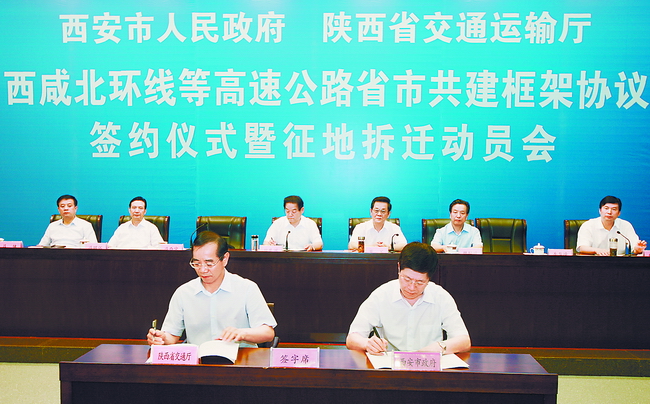 为贯彻落实全省加快公路建设会议和加快全省高速公路建设推进会精神,6月20日上午,西安市政府和省交通运输厅共同举办西咸北环线等高速公路省市共建框架协议签约仪式暨征地拆迁动员会。省委常委、西安市委书记魏民洲出席会议,西安市市长董军讲话,省交通运输厅厅长冯西宁讲话并与西安市常务副市长岳华峰分别在协议书上签字。