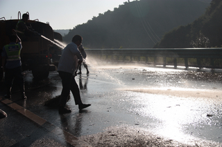 道路水毁灾情发生后,宜富分公司防汛抢险领导小组第一时间赶赴现场查勘灾情,并立即启动应急预案,迅速组织员工和抢险队伍实施交通管制和抢险救灾。同时,紧急召开现场抢险工作部署会,实行领导班子成员分片包干工作制,多个水毁路段同步施工,确保抢险救灾工作全面有序推进,第一时间抢通辖段内各交通中断路段。22日中午12:30,富县连接线基本抢通,恢复单车通行。22日下午16:20,主线K1176+500(吉家村隧道入口处),K1180+300处、K1180+400处、K1181+100处、K1181+500处基本抢通,可恢复双向通行。22日下午18:00,从富县至包茂高速厢西堡互通立交段,被困车辆已全部疏散,该段交通基本恢复,小车可双向通行,有效缓解了包茂高速和富县县城内的交通压力。22日晚23:00,秋树梁隧道(K1186)下行线(兰州至青岛方向)出口抢通,宜川境K1120+900双向四车道全部抢通。24日下午15时,石家河隧道上行线(青岛至兰州方向)洞内外约2000米淤泥被彻底清理,并将路面清洗干净,实现了单洞双向混合通行。24日下午15:30,羊泉隧道入口处(下行线K1196+800)约200米塌方和泥石流被清理完毕,并将路面清洗干净,羊泉隧道上下行线恢复正常通行。截至24日晚21:00,青兰高速陕西境全线抢通,恢复正常通车,无任何交通事故和人员伤害事件发生。本次防汛抢险,宜富分公司共投入人力2393工日,装载机91台班,挖掘机35台班,除雪车30台班,洒水车68台班,自卸车107台班,路政等其他抢险车辆133台班。