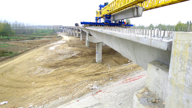 渭河特大桥全长1253米,该桥的曲线半径为1000米,横坡为4%,设计有35跨,长度不等、角度不同的预制箱梁175片。