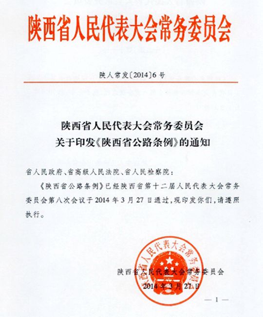 3月27日,《陕西省公路条例》经省十二届人大常务委员会第八次会议通过,自2014年7月1日起实施。《条例》是统领和规范全省公路工作的纲领性法律文件,是解决公路规划、建设、养护、管理中遇到突出问题的重要法律依据,《条例》全面、系统地对各部门的监管职责、公路建设项目招投标、资金筹集监管、公路养护管理、应急服务等内容进行了规范,并针对收费公路和农村公路的特殊情况进行了特别规定。《条例》是我省公路方面第一部综合性地方法规,标志着陕西省公路工作迈上了规范化、法制化的新台阶,对于提高全省公路工作的依法行政水平,具有十分重要的作用。