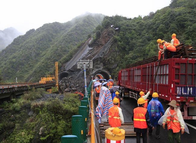 8、西康高速因持续强降雨天气引发山体滑坡致桥梁垮塌,交通部门全力以赴紧急抢修,保障了国高网大通道的畅通运行