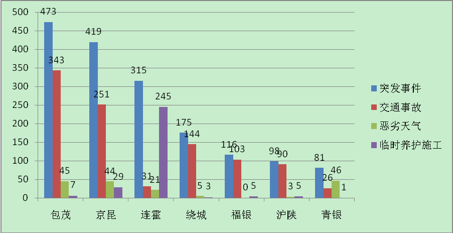 2015年高速公路突发事件主要分布在包茂高速、京昆高速、连霍高速、福银高速陕西段及绕城高速,占突发事件总量的78.27%。
