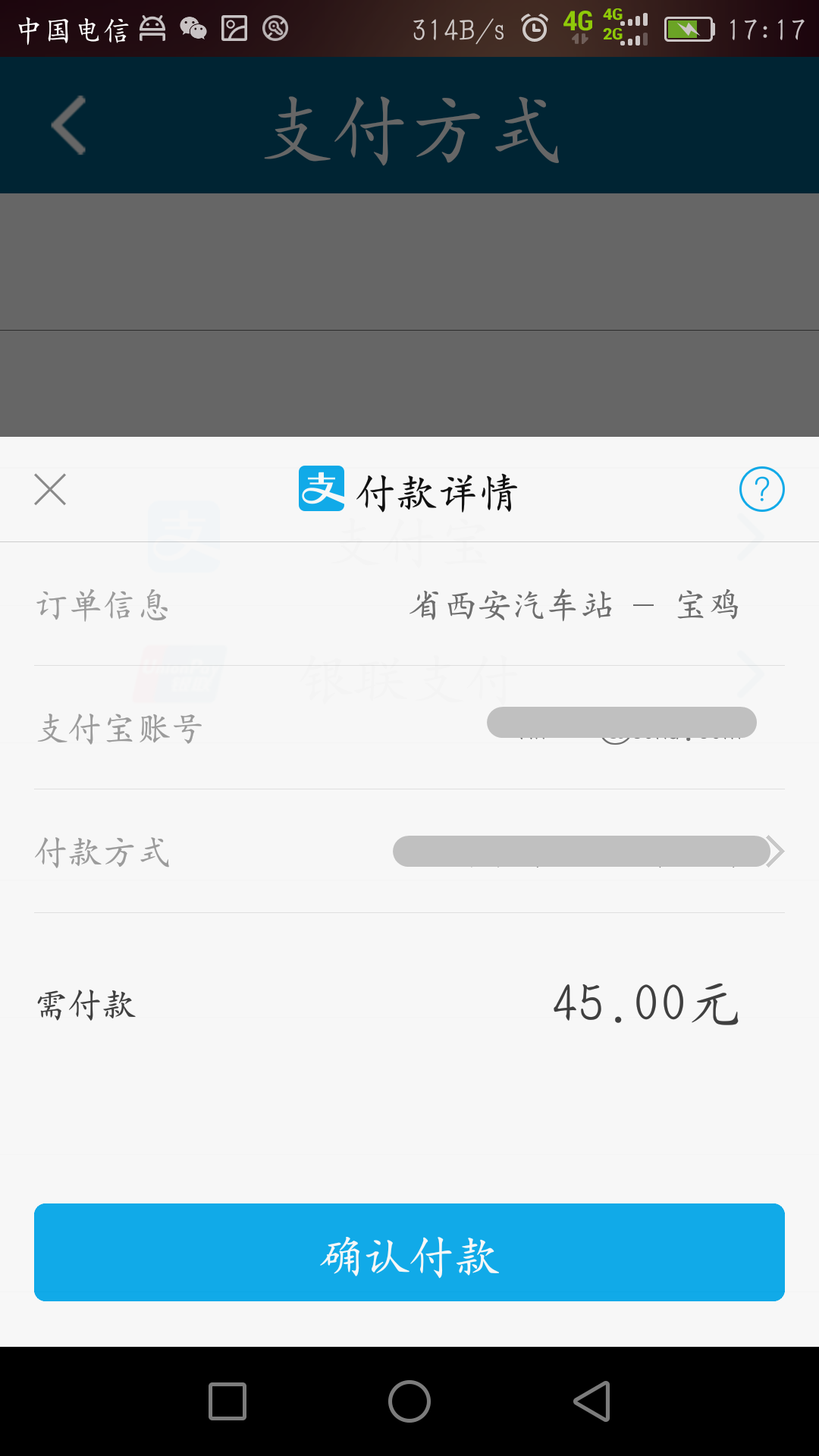 3.信息确认:班次信息确认无误后点击“确认订票”——添加乘客信息——订单信息核对无误后选择支付方式(目前支持支付宝和银联两种支付方式)