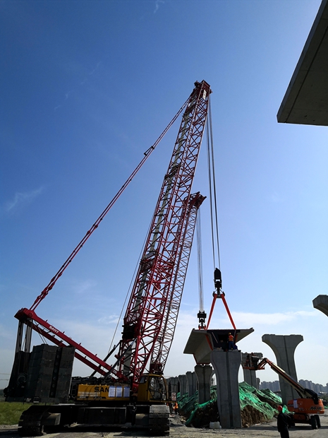 为尽早完成出入段线的箱梁架设任务,给后续轨道、四电和机电设备安装提供施工条件,出入段线采取了轮胎式运梁车公路运梁、两台350t履带式起重机进行架设的方案,方案经设计院检算和专家评审后组织实施。