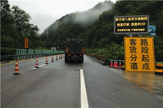为保证客货分道通行措施的顺利实施,西汉分公司采取了多项针对性措施,一是成立专门组织机构,多次召开路警联勤联动会议商讨和制定实施细则。二是抽调16名人员和2辆路政制式车辆组建两个客货分道管理小组,分别管理西安和安康辖区,实行4班3运转工作模式,全天候管理客货分道路段,对不按规定行驶的车辆进行喊话纠违,对违规行为进行拍照取证,利用沿线电子情报板进行违规通报。三是对原有标志标牌进行改造,明确提示客货分道路段起始点位和终止点位。在林场停车区设立客货分道起始路段管控点,通过摆放标志标牌,警示车辆开始分道行驶。四是强化联勤联动,与辖区高交部门实行交叉式巡查模式,加大巡查力度。协调地方清障车辆分别派驻在秦岭服务区和涝峪口收费站24小时待命,及时处置各类突发事件。