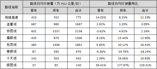 上半年全省高速公路网行驶量空间分布与年同期基本一致,主要通道中G5京昆高速、G65包茂高速、G30连霍高速及G70福银高速陕西段的行驶量,占全省高速公路网总行驶量的6成左右;其次为G20青银高速和G3002西安绕城高速,分别占全年路网行驶量的5.70%、6.59%。银昆高速由于汉坪段的通车,行驶量同比增长129.31%,增幅最高。