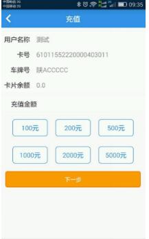 (8)核对用户名称、卡号、车牌号、卡片金额,无误后选择充值金额或手动输入充值金额,并点击‘下一步’按钮,页面跳转到充值银行选择页面,如图8所示: