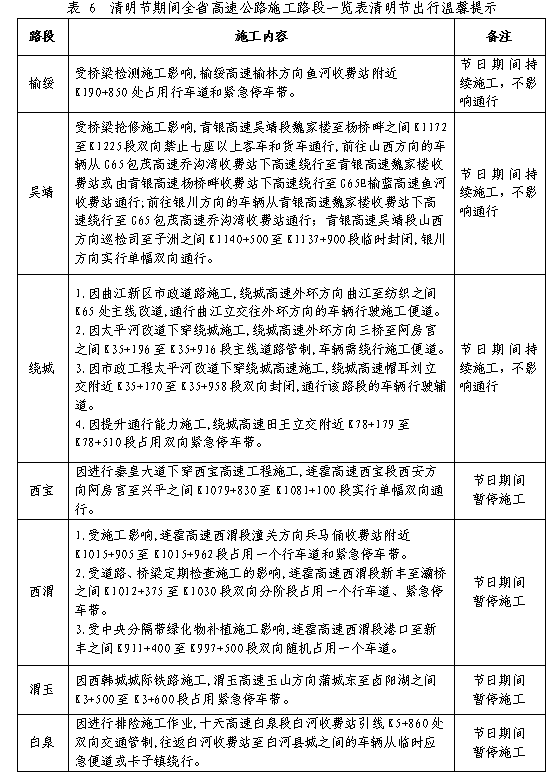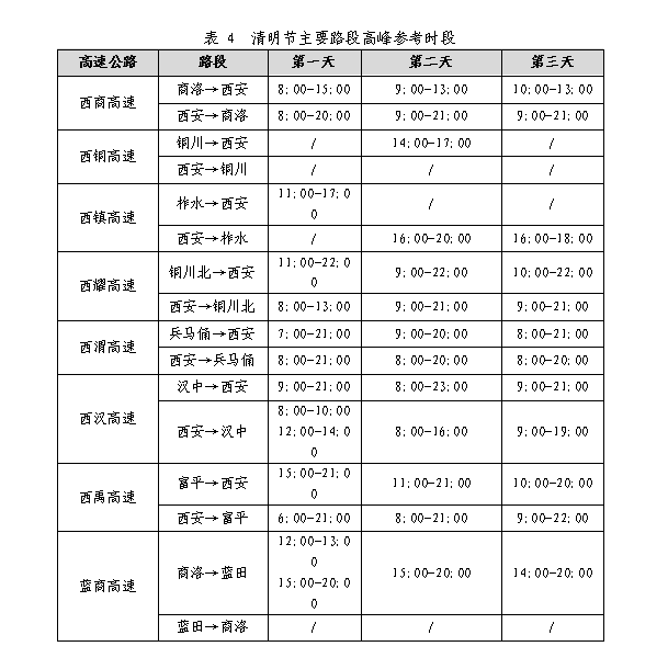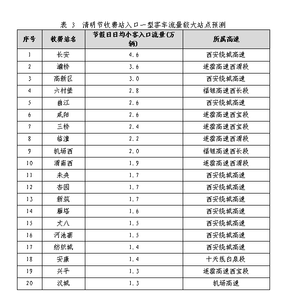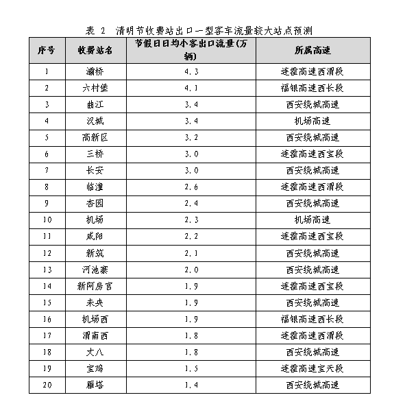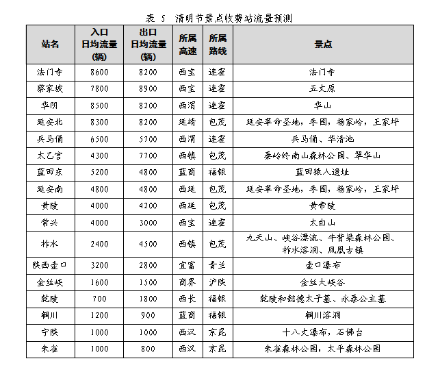 陕西省高速公路清明节期间流量较平日增长较多,去往法门寺、华山、延安等热门景区的高速公路出入口通行压力大。详细预测情况见下表: