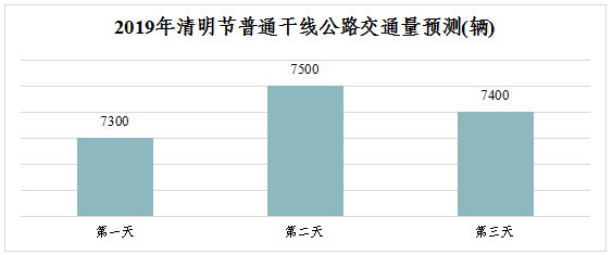 预计2019年清明节期间,普通干线公路网日均交通量约为7400辆,是平日流量的1.04倍。