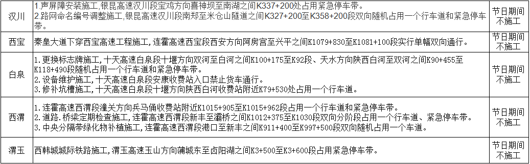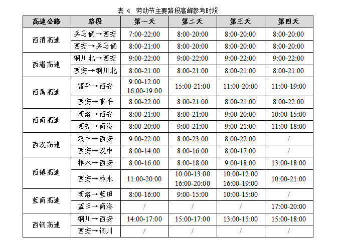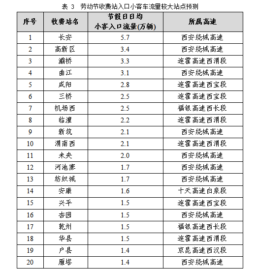 2019年劳动节小长假,预计西渭高速(入西安方向)、西耀高速(入西安方向)、西禹高速(禹门口方向)车流量较平日将有大幅增长。