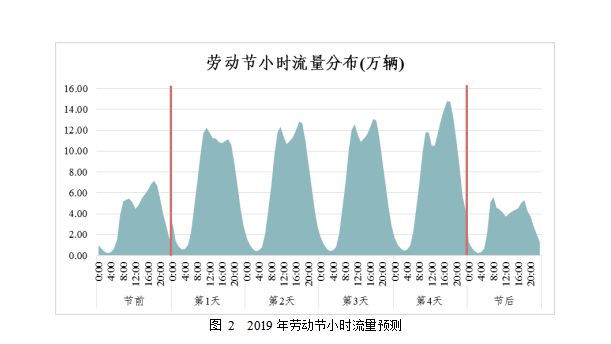 根据往年小长假流量变化规律,预计2019年劳动节最后一天(2019/5/4)流量最大,当日流量为平日的2.26倍。劳动节期间每日9时-12时、16时-19时是高峰时段,高速公路通行车辆较多,重要城市收费站容易出现拥堵排队现象,请司机朋友尽可能合理安排时间错峰出行。